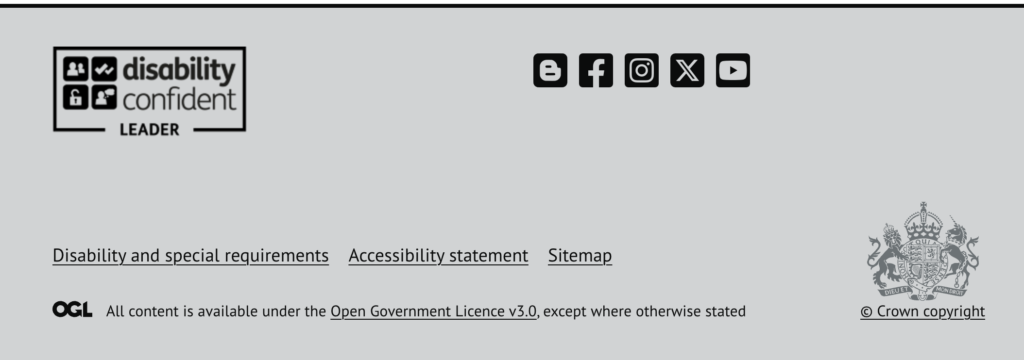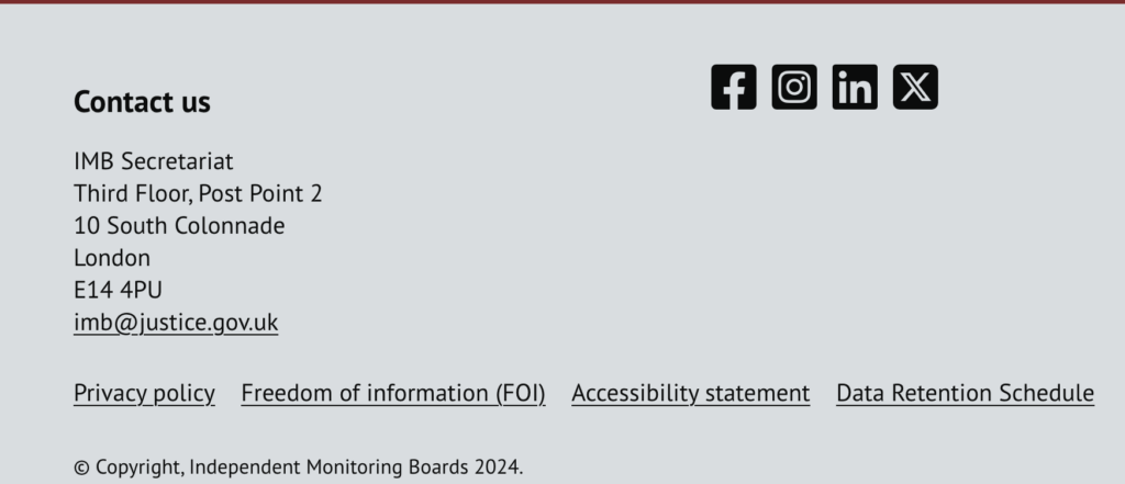 Another example of footer navigation from the Prison and Probation jobs website, which also includes an image and social media icons with links (called ‘footer widgets’):