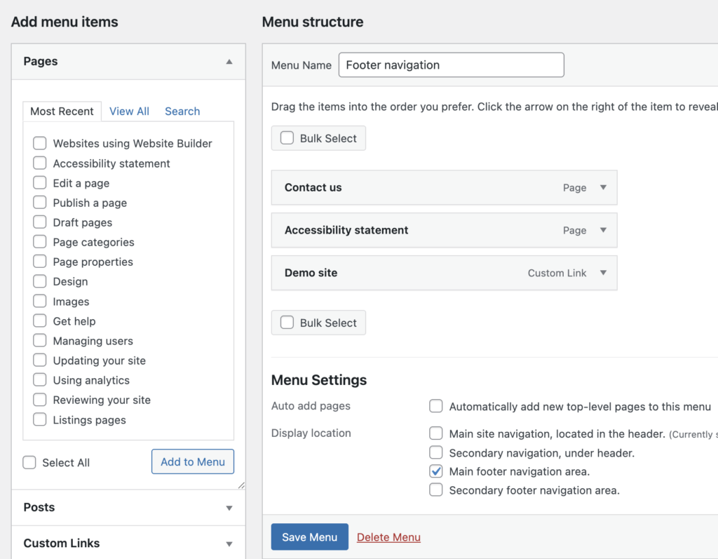 Click on the ‘Select a menu to edit’ drop down, pick ‘Footer navigation (Main footer navigation area.)’ from the list and click ‘Select’.