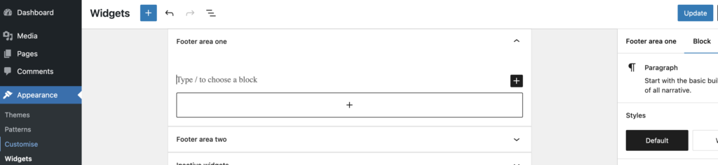To edit the footer area, use the plus (+) symbol to add content blocks as you would to build a page. Click ‘Update’ when you’ve finished. This will make the changes live on your site.