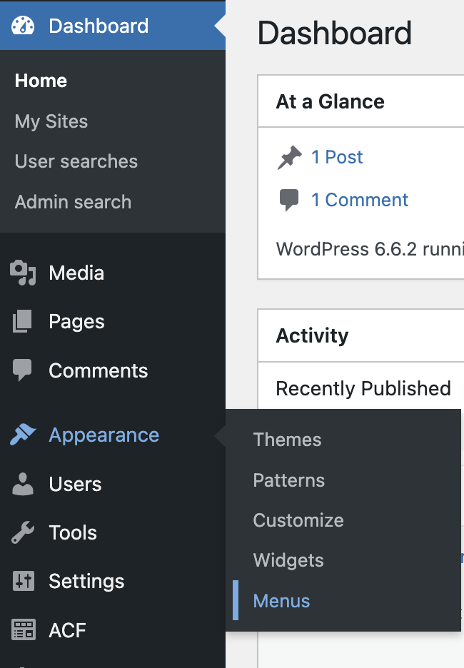 From your site dashboard, go to ‘Appearance’ and then ‘Menus’.