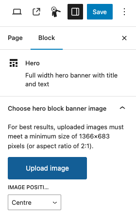 You can select or upload the image for the hero from the ‘Media Library’ in the right-hand column of block options.