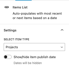 The items list block is usually used on a website’s homepage. When added, it automatically populates with the most recent or next ‘items’ based on a date.