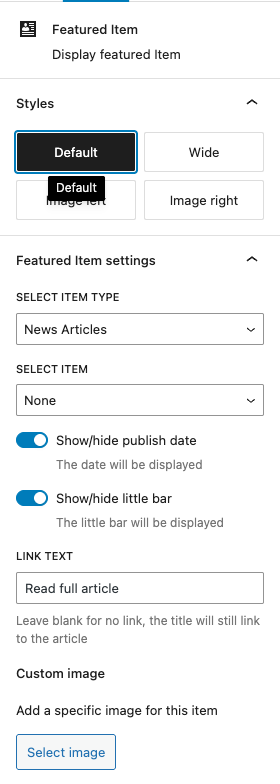 This block is also mostly used on a homepage and is a way of choosing a featured ‘item’ to display.